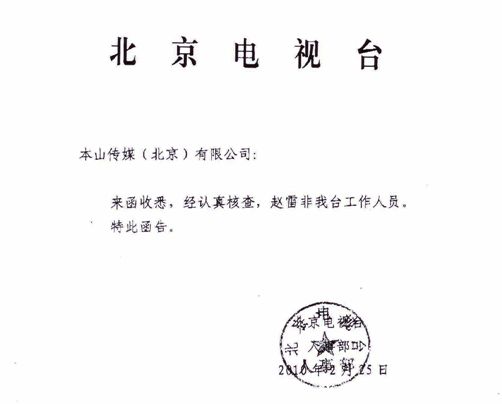 近日,在網(wǎng)上出現(xiàn)了一條消息,作者自稱是北京電視臺導演趙雷。消息稱趙本山在央視春晚演完《捐助》后,因為小沈陽有兩個廣告包袱沒抖出來,在后臺打了小沈陽兩記耳光。對此,本山傳媒鄭重聲明,這條消息純屬捏造。另外,本山傳媒已致函北京電視臺人事部,了解趙雷的身份。北京電視臺人事部回函聲明,趙雷不是北京電視臺工作人員。