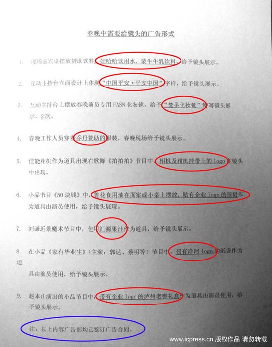 近日網(wǎng)絡(luò)上曝光的一張題為“春晚中需要給鏡頭的廣告形式”清單上共列出九條廣告植入條目,包括飲用水、化妝鏡、服飾、相機(jī)、酒等,外界十分關(guān)注的劉謙魔術(shù)、趙本山小品《捐助》、郭達(dá)蔡明的小品都有涉及。