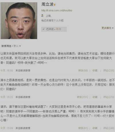 采訪首先圍繞關(guān)周分手。周立波說:“我很無辜,老關(guān)也很無辜,有人在中間挑事,我們會查的!彼嬖V記者,知道媒體“踢爆”兩人分手一事時,他正在與前紐約警察局華人局長莫虎一起喝酒,而當(dāng)天下午他剛在無畏號航母上看了“珍珠港事件”的紀(jì)錄片,當(dāng)時他的第一個反應(yīng)是“沒想到我也遇上珍珠港事件了”。由于當(dāng)時認(rèn)為是關(guān)棟天向媒體“踢爆”此事,而且當(dāng)晚酒喝得比較多,因而在微博上寫下了幾段很有爭議的博文,包括“泡飯鮑魚”說。“結(jié)果阿春(孫徐春)用人格向我擔(dān)保決不是‘老怪頭’(周立波和孫徐春對關(guān)棟天的昵稱)說出去的,我相信他。”周立波表示,此次分手只是藝術(shù)和商業(yè)上的分手,兩人的藝術(shù)觀點(diǎn)不同。