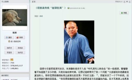 繼韓寒“被封時代周刊影響人物”事件之后,昨日有網(wǎng)友在論壇瘋狂轉(zhuǎn)載韓寒的最新博文《請別誤傳我“挺郭貶周”》的相關(guān)博客截圖和內(nèi)容,該帖子在網(wǎng)上引起了廣泛的熱議,因為韓寒在文中還意外曝出周立波曾和郭德綱在爭演迪斯尼電影《歌舞青春》一角色時、私下相互較勁并以自降身價“零報酬”方式搶戲的相關(guān)內(nèi)幕,被網(wǎng)友戲稱為“郭周搶角門”。不過記者上網(wǎng)發(fā)現(xiàn)韓寒博客中的這篇博文已經(jīng)被刪除,為了進(jìn)一步求證博文內(nèi)情及真?zhèn)危浾咴噲D聯(lián)系韓寒,不過其手機(jī)一直處于呼叫轉(zhuǎn)移留言狀態(tài),隨后記者通過手機(jī)和博客發(fā)短信留言采訪,截至發(fā)稿時,韓寒方面并未給予回應(yīng)。