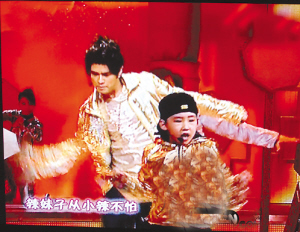 昨晚首次正式登場(chǎng)的周杰倫一身金色上場(chǎng)表演《本草綱目》時(shí),并不是一個(gè)人在演唱,他還帶了個(gè)小朋友——一個(gè)與他同樣在RAP、HIPHOP舞步上很有表現(xiàn)力的男孩子,大男生帶小男生的組合贏得不少掌聲。