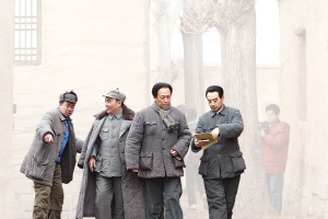 連續(xù)兩天下雪,懷柔影視基地也一片銀裝素裹。記者進(jìn)入拍攝現(xiàn)場時,工作人員一再叮囑,一定要跺跺腳再進(jìn)去,免得在剛剛打掃好的通道上再踩上雪。而這個通道,就是片中毛澤東、周恩來、朱德等眾多人物步入七屆二中全會會場的通道。