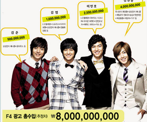 李民浩、金賢重等《花樣男子》主演們也身價倍增,“韓版F4”的各種廣告收入加起來已經(jīng)超過了80億韓元。