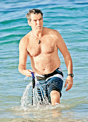 皮爾斯與Keely上周帶同兩個(gè)兒子在夏威夷的考愛島旅行度假,這位卸任“007”身形不復(fù)以往,穿著沙灘褲和兒子玩耍的布魯斯南啤酒肚無所遁形,但老婆Keely的情況更嚇人,只穿上比基尼泳衣的她,估計(jì)體重達(dá)300磅,巨胸與巨臀完全現(xiàn)形,腹部更清晰可見兩條“車胎”,有傳媒就取笑說Keely在沙灘出現(xiàn)的情景,好比鯨魚擱淺在沙灘一樣震撼人心。不過皮爾斯夫婦并未理會(huì)別人的目光,他們在沙灘上一時(shí)玩飛碟,一時(shí)玩浮潛,一家四口更經(jīng)常玩到開心大笑。