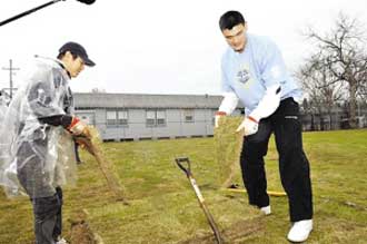 日前,功夫巨星李連杰與中國(guó)球員姚明一起出席了美國(guó)NBA全明星慈善活動(dòng),參加了新奧爾良巨星城的慈善植草皮活動(dòng)。這個(gè)城市在去年遭受到了“卡特琳娜”颶風(fēng)的襲擊,因此這次的全明星球員們不僅僅只是會(huì)去比賽,還會(huì)幫助當(dāng)?shù)鼐用駛冏鲆恍┐壬频氖虑。其中中?guó)球員姚明和著名的功夫巨星李連杰也在這些慈善事情中做出了自己的貢獻(xiàn)。圖為李連杰與姚明一起合作植草皮。