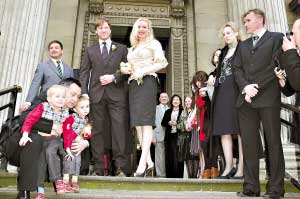 29歲的蘇克利夫穿著絲質的金色低胸上衣,配搭長黑裙,捧著花束,看來十分嬌羞美麗,肖恩·賓則穿著藍色西裝,配著不協(xié)調的棕色靴,臉上蓄著胡子。對著大批包圍的媒體,肖恩·賓滿臉笑意地說:“結婚的感覺棒透了。”