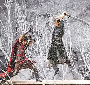 為了遷就計算機特效,2位主角有許多臨時設(shè)計的對打戲,昨就是臨時加了“砍頭”戲分,沒有事前套招才造成郭富城掛彩。