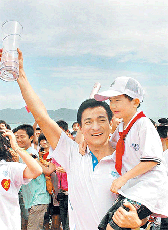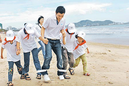 中新網6月6日電 據(jù)臺灣媒體報道,劉德華(華仔)日前帶著80名災區(qū)小朋友,參加在海南島三亞灣舉辦的“汶水入海”四川賑災活動。華仔與小朋友玩起5人6腳在500米長的沙灘上進行接力傳遞,華仔最后還抱起1名災區(qū)小朋友,將象征愛心與祝福的汶川之水舉起倒入大海,完成儀式。