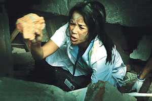 劇照中,蔣雯麗蹲在一片廢墟之中,身上、臉上全是泥,她用雙手在鋼筋瓦礫的廢墟中扒找自己的同事和醫(yī)藥箱。拍攝現(xiàn)場,混凝土塊還懸在半空中,搖搖欲墜。
