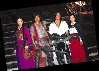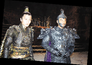 走進一間已經(jīng)被布置成刑房的攝影棚,巖石碎塊構成了粗糙的地面,幾把劍插成了劍壇,臺階上火爐冒著火苗,空中還懸著幾塊爬著蟲蛆的火腿,幾臺鼓風機正開足馬力吹著風……看前面,一堆人正在你推我一把,我攻你一招,原來替身正在幫任達華試戲。對披著長發(fā)造型的鄭伊健、郭富城以及何家勁來說,炎熱恰是專門跟耍帥作對的。問到郭富城對于造型的看法,郭富城當即冒出一句“非常熱”,F(xiàn)場汗流浹背的阿Sa抱怨說,飾演聶風的鄭伊健可謂是片中最舒服的一位,不僅戲服相對清涼,由于名為“風”,因此拍戲的時候可以充分享受鼓風機的待遇。