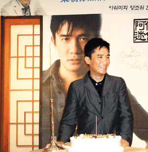 梁朝偉對(duì)著歌迷們準(zhǔn)備的生日蛋糕眉開(kāi)眼笑。