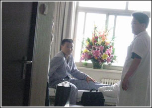 半個多小時后,一位醫(yī)生例行查房推開了任程偉的病房門,站在走廊里的記者看見任程偉身穿病號服斜躺在病床上,氣色有些灰暗,神情憔悴,雙腿好像不能動彈。他回答醫(yī)生問題時聲音也很微弱,與他前不久登臺領(lǐng)獎時神采飛揚的樣子簡直判若兩人,而醫(yī)生則一直在勸慰任程偉。醫(yī)生走后,病房里傳來了一陣手機鈴聲,任程偉強打精神地通著話,臉上露出勉強的笑容,通話結(jié)束后,他就疲倦地倒在了床上,熒屏上的硬漢此時看上去特別虛弱。隨后記者撥打任程偉的電話,電話已經(jīng)關(guān)機,而他經(jīng)紀人的電話也已轉(zhuǎn)到秘書臺,截至發(fā)稿時任程偉的病情還沒有得到進一步的證實。 卓偉