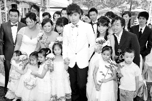 上周六,古巨基在臺(tái)北為十對(duì)新人進(jìn)行證婚。自喻為“愛(ài)情見(jiàn)證大使”的古巨基當(dāng)天也身穿白色禮服,手牽穿著小禮服的六歲小女友,帶領(lǐng)十對(duì)婚紗新人走紅毯?吹娇蓯(ài)的小花童和擔(dān)任他女伴的小女友以及十對(duì)美麗新人,古巨基被浪漫氣氛打動(dòng):“一直很想結(jié)婚!因?yàn)楹芟蛲闪⒓彝サ母杏X(jué),但可惜一直沒(méi)有遇到另一半!”雖然身邊的六歲小女伴私底下說(shuō)喜歡古巨基哥哥,但是當(dāng)古巨基當(dāng)著大家面前說(shuō):“我等你12年,你嫁給我好嗎?”時(shí),小女伴卻害羞地連續(xù)20多次推開(kāi)古巨基的麥克風(fēng),甚至還讓基仔撞到牙齒并且大呼“不要”,讓古巨基的求婚尷尬被拒。