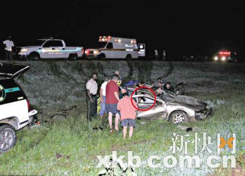 禍現場,摩根駕駛的車輛嚴重變形,救護人員正在搶救摩根。