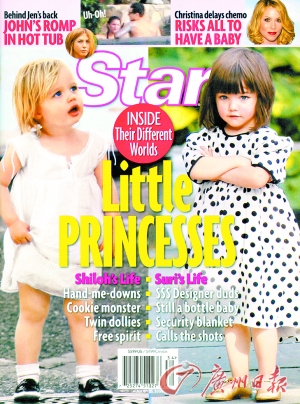 8月19日,布拉德·皮特與安吉麗娜·茱莉的女兒希洛(Shiloh)、湯姆·克魯斯與凱蒂·赫爾姆斯的女兒蘇瑞(Suri Cruise)雙雙登上了《Star》雜志的八月刊。在照片中,希洛仰頭望天,讓人忍不住想要去親她,而蘇瑞則雙手在胸前交叉,一副傲慢小公主的樣子,也十分可愛。