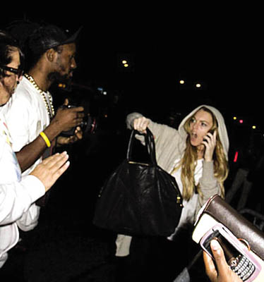 上周日晚,Bowery酒店門前,身穿連帽衫的琳賽·洛韓企圖跨過一個(gè)障礙,就在這時(shí),意想不到的事情發(fā)生了——正在打電話的她誤以為一名記者企圖將她絆倒,于是她揮拳打向了那名記者!打完之后,她對(duì)著電話那頭的人說:“噢,我的上帝,我打了一名狗仔記者!