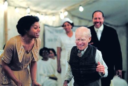 《本杰明·巴頓奇事》是一部劇情怪誕的影片。影片的男主人公是個(gè)叫本杰明·巴頓的怪人(布拉德·皮特飾),他一生下來就是個(gè)滿頭華發(fā)、一臉褶子的古稀老頭(劇照中皮特的體型很小,估計(jì)是個(gè)“老嬰兒”)?善婀值氖牵纳镧娛堑怪叩摹?jiǎng)e人越活越老,他卻越活越小。巴頓1919年出生,不經(jīng)意間愛上了一個(gè)名叫黛西的6歲女孩,30年后,兩人終于“長”得年齡相仿了。他們彼此相愛,度過了人生中最美好的一段時(shí)光。皮特在化裝和特效的幫忙下,變成了一個(gè)貌似被風(fēng)干的小老頭,形象十分驚人,與壯碩的皮特判若兩人。 欣聞