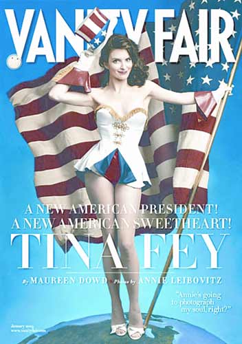《名利場》雜志2009年1月號封面,邀在大選期間因模仿共和黨候選人莎拉·佩林而走紅的蒂娜·菲當(dāng)封面女郎。照片中,菲穿著美國國旗色的性感低胸超短裙,手執(zhí)美國國旗,神采飛揚,雜志封面的大標(biāo)題是“新美國總統(tǒng),新美國甜心”。蒂娜·菲還在該雜志的專訪中透露自己是扁平足患者。