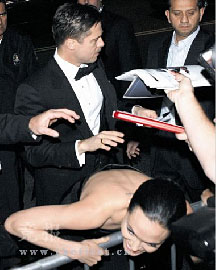 影迷們見到兩位明星瘋狂吶喊,蜂擁而上期望與偶像近距離接觸,結(jié)果茱莉被人流擠得動彈不得,緊抓欄桿向老公求救,卻依然面帶笑容保持風度。皮特把影迷們丟到了一旁,趕忙過去搶救茱莉。記者張碩