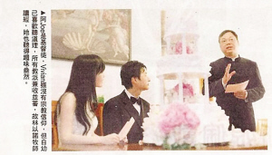 5日下午,一眾出席倪周婚禮的賓客在四時(shí)前到場(chǎng),獲邀擔(dān)任證婚人的是好友Kenny與丈夫吳先生;橐霰O(jiān)理人由陳姓律師擔(dān)任,儀式簡(jiǎn)單卻神圣。一對(duì)新人宣讀誓詞,然后交換結(jié)婚戒指,簽上名字,再將別致的羽毛筆交到婚姻監(jiān)理人與證婚人手上,簽名后林以諾牧師現(xiàn)身,宣讀哥林多前書十三章至八節(jié)——愛(ài)是恒久忍耐,又有恩慈,愛(ài)是不嫉妒,愛(ài)是不自夸,不張狂……以祝福一對(duì)有情人,壓軸節(jié)目是新人切結(jié)婚蛋糕,與眾同樂(lè),一起分享甜蜜滋味。