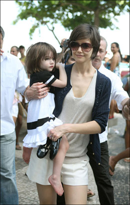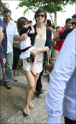 正在巴西度假的凱蒂·赫爾姆斯昨日(2月2日)帶著自己可愛的小女兒在巴西的海灘上悠閑的走著,白色的短褲襯得美腿秀場(chǎng),藍(lán)色的外衣輕巧的抵擋這紫外線的困擾,半臉墨鏡體現(xiàn)非凡氣質(zhì),一雙阿瑟丁·阿拉亞涼鞋提升品味,活脫脫一個(gè)高大版的芭比娃娃。而懷中抱著的孩子簡(jiǎn)直就是天使降臨,粉嫩的皮膚,配上白色的小裙子,可愛至極。