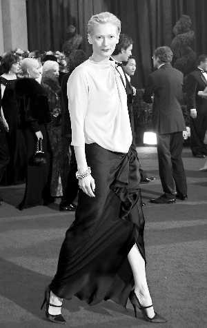 蒂爾達在奧斯卡一向喜歡以特立獨行的雷人裝扮出現(xiàn),這次同樣沒讓人失望。暗淡的淺金色加黑裙搭配很怪異,像去趕一場普通會議,艷麗的紅唇又好像彰現(xiàn)奢華,總之過于隨便。