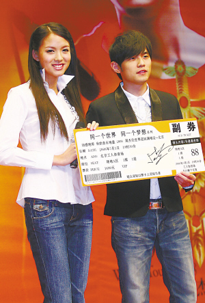 周杰倫在現(xiàn)場(chǎng)把首張VIP門票送給了新晉世界小姐張梓琳。記者 郭延冰 攝