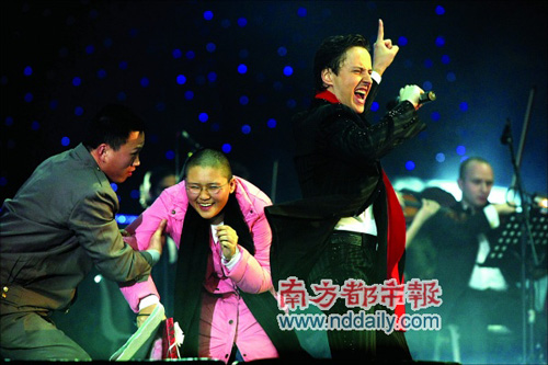 上周六晚,俄羅斯神奇的男高音Vitas第二次來(lái)到廣州開(kāi)唱。當(dāng)晚,高到男女莫辨的聲音響徹廣州新體育館,寒冷的空氣中人群沸騰。《星星》、《歌劇2》、《第五元素》等挑戰(zhàn)人類聲音極限的歌曲得到了觀眾最熱烈的歡呼。Vitas第二次來(lái)廣州也放開(kāi)膽量走進(jìn)了瘋狂的觀眾席,成功引起場(chǎng)內(nèi)人流洶涌,滿場(chǎng)騷動(dòng)。也正因?yàn)楦杳詡兲?dòng),讓此番Vitas廣州、深圳兩場(chǎng)演唱會(huì)充滿驚險(xiǎn)。被歌迷摸臉、強(qiáng)吻、拉倒的場(chǎng)景屢次出現(xiàn),甚至還有獻(xiàn)花女粉絲當(dāng)場(chǎng)暈倒在舞臺(tái)上,讓一直保持迷人微笑的Vitas都手足無(wú)措。