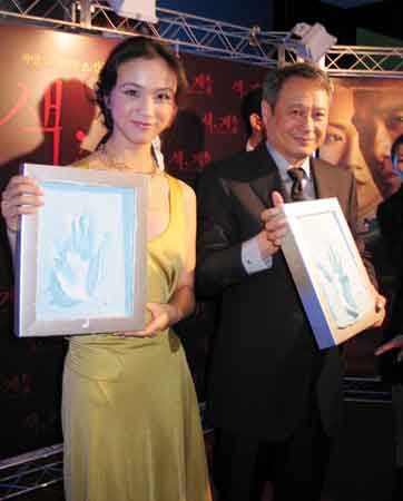 “中央社”報道說,李安和湯唯在影片“色•戒”的韓國發(fā)行商“C.J.娛樂公司”的安排下,今天下午六點半,冒著早冬的寒雨,走上龍山CGV戲院售票區(qū)的紅地毯,向圍守在現(xiàn)場的媒體記者、粉絲近四百人,和藹可親地握手答謝,并按捺了手掌印模,展現(xiàn)出極為熱誠的態(tài)度。