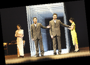 如果你中途進(jìn)場(chǎng),舞臺(tái)上8個(gè)人走來(lái)走去可能會(huì)讓你有點(diǎn)摸不著頭腦。穿著一樣的西裝背心和西褲的兩個(gè)振保,辛柏青代表世俗的、不得不扮給社會(huì)看的表象的振保,而高虎則代表內(nèi)心的那個(gè)不時(shí)想出軌、不時(shí)與自己斗爭(zhēng)的內(nèi)心的振保。而紅玫瑰和白玫瑰也都有兩個(gè),同樣一個(gè)是內(nèi)心想做的、一個(gè)是表象必須做的:你可以看到秦海璐飾演的紅玫瑰在與振保調(diào)情,而舞臺(tái)后方另一個(gè)與她同樣打扮的紅玫瑰還在與丈夫王士洪悠閑地聽(tīng)著唱片;你可以看到胡靖釩飾演的白玫瑰在囑咐丈夫振保“出門(mén)記得帶傘”,而在她身后另一個(gè)白玫瑰正在與小裁縫曖昧地聊天……一開(kāi)始還真有點(diǎn)不適應(yīng),可看進(jìn)去卻覺(jué)得這種形式非常新奇有趣。經(jīng)常是,2個(gè)振保、4朵玫瑰,加上王士洪和小裁縫8個(gè)人一起出現(xiàn)在舞臺(tái)上,一起說(shuō)話、一起行動(dòng),奇怪的是,作為觀眾的你并不覺(jué)得混亂。舞臺(tái)形式也很有趣,舞臺(tái)中央一道玻璃通道,2個(gè)振保一同從幕后走進(jìn)通道,然后分別打開(kāi)通道兩側(cè)的門(mén),一個(gè)走進(jìn)現(xiàn)實(shí)生活中與白玫瑰的家,另一個(gè)走進(jìn)另一側(cè)與紅玫瑰的回憶。