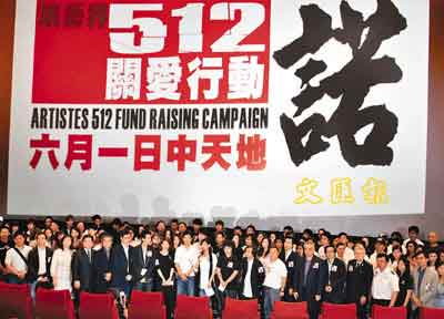 據(jù)香港文匯報(bào)報(bào)到,昨日近兩百余演藝界人士參加了記者會(huì),短短十五分鐘談話便結(jié)束,會(huì)上先由活動(dòng)召集人劉德華發(fā)言,他先為各界的支持致意,華仔又哽咽地說:“四川大地震發(fā)生,演藝界短短時(shí)間內(nèi)發(fā)起行動(dòng),大家勞心勞力,但這份熱情不是一時(shí)三刻,重建需時(shí)要三、五、七年,重建災(zāi)民的生活,是我們的承諾,我特別多謝中聯(lián)辦及香港電影發(fā)展基金于行動(dòng)中的協(xié)助,以及西九龍中天地六月一日借出場(chǎng)地舉行賑災(zāi)大匯演,由于時(shí)間倉(cāng)卒,不夠時(shí)間向有關(guān)政府部門申請(qǐng),但深信活動(dòng)會(huì)得到大家的響應(yīng)及支持,寄望天佑四川,天佑中國(guó)!