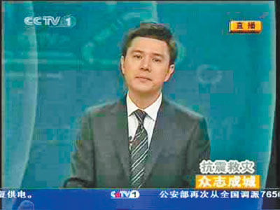 “為什么我們總是被這樣的聲音,這樣的畫(huà)面感動(dòng),為什么我們總是看著看著就會(huì)眼含熱淚,”5月14日中午,趙普在主持央視“眾志成城 抗震救災(zāi)”地震直播節(jié)目,當(dāng)看到前方記者發(fā)回的報(bào)道畫(huà)面后,趙普禁不住哽咽了。觀眾可以明顯地看到,趙普的眼眶濕潤(rùn)了,為此他不得不低頭調(diào)整一下情緒。