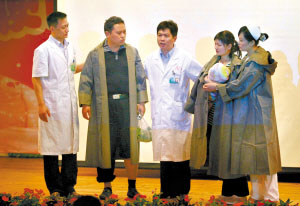 前日,由廣東省第二人民醫(yī)院(以下簡稱省二院)辛苦籌備5天的“天使的愛”抗震救災(zāi)專題文藝演出在省二院禮堂舉行,全部節(jié)目幾乎都由省二院醫(yī)護(hù)工作者中的“文藝尖子兵”擔(dān)綱主演,現(xiàn)場表演的京劇演唱《醫(yī)患魚水情》,曲調(diào)來自《沙家浜選段》的《魚水情》,本是講“軍民魚水情”,填上新詞變成了醫(yī)患之間的諧趣唱段,如“精心護(hù)理真不差”之類,逗得現(xiàn)場觀眾笑逐顏開。