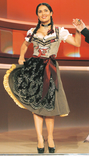 墨西哥性感女星薩爾瑪·海耶克近日盛傳與法國名牌大亨皮諾前日登上德國電視節(jié)目《Wettendass...?》,并穿上當(dāng)?shù)貍鹘y(tǒng)服飾大跳土風(fēng)舞,低胸的上衣令其36C上圍呼之欲出,連同場的名牌Chanel設(shè)計師“老佛爺”卡爾·拉格菲爾德也看得目不轉(zhuǎn)睛。