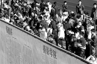 今年表演學(xué)院有4300多名考生報(bào)考,共1500多名考生進(jìn)入2月11日下午開(kāi)始的復(fù)試,有2/3人被淘汰。表演學(xué)院副院長(zhǎng)王勁松說(shuō),今年進(jìn)入復(fù)試的人數(shù)比往年少,因?yàn)榻衲曛徽惺毡究粕,所以把關(guān)更嚴(yán)格。