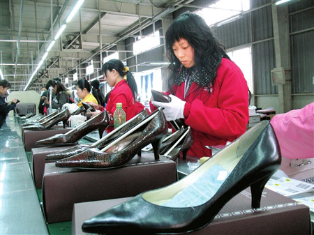 昨天下午,記者來到位于武侯區(qū)簇橋簇馬工業(yè)園成都依百蘭鞋業(yè)。工廠內(nèi)四條生產(chǎn)線正加足馬力生產(chǎn)Bandolino的訂單,其中一條流水線上生產(chǎn)的,正是奧巴馬夫人穿的那款鞋。