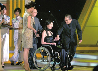 張藝謀、宋祖英為劉巖頒發(fā)“中國(guó)年度舞蹈最佳表現(xiàn)女演員獎(jiǎng)”。劉巖坐著輪椅緩緩上臺(tái)時(shí),張藝謀連忙跑過(guò)去幫扶。劉巖哽咽著說(shuō):“為了奧運(yùn),我們舞者獻(xiàn)出了所有力量,雖然最后我沒(méi)能演出,但是依然感到光榮!