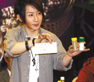 隨后,劉謙開始為現(xiàn)場的媒體記者表演了一個小魔術(shù),只見他拿出了鹽與胡椒粉,將其混在一起,并脫掉了自己手上所有的戒指,把袖子也卷了起來,在瞬時把鹽和胡椒粉分開了。正當(dāng)大家驚呼劉謙水平高時,劉謙突然自己給這個魔術(shù)解密!斑@個魔術(shù)其實(shí)已經(jīng)流傳了100多年了,這個胡椒粉其實(shí)是鐵砂,我手中藏了一塊磁鐵,只要用磁鐵一吸,鐵砂就從鹽中分離出來了。不過,我在5月8日首演時,將會把真正的混在一起的鹽與胡椒粉在10秒之內(nèi)分開,這才是我最新的魔術(shù)。”
