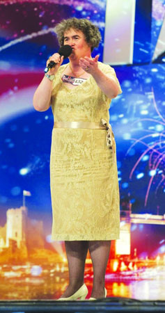 4月11日,沒(méi)有接受過(guò)任何聲樂(lè)訓(xùn)練的蘇珊走上了舞臺(tái)。聚光燈下,當(dāng)身材肥胖的她告訴現(xiàn)場(chǎng)所有人她的夢(mèng)想是成為伊蓮·佩姬(英國(guó)音樂(lè)劇女神)時(shí),包括評(píng)委在內(nèi)的所有人都狂笑不已。但當(dāng)她一開(kāi)口之后,眼神立即變得柔情萬(wàn)種,歌聲中具備了驚人的爆發(fā)力與磁性……從那時(shí)起,先前的笑聲戛然而止,現(xiàn)場(chǎng)除了掌聲便是尖叫!一曲唱罷,觀眾們紛紛起立熱烈鼓掌,幾個(gè)歲數(shù)很大的觀眾偷偷用手擦去感動(dòng)的眼淚。評(píng)委之一的西蒙驚訝得張大了嘴巴;評(píng)委皮爾斯·摩根更直呼:“現(xiàn)在沒(méi)人笑你了,你的表演震撼、無(wú)與倫比!而你更是我們這個(gè)節(jié)目開(kāi)辦三年來(lái)最大的驚喜!”
