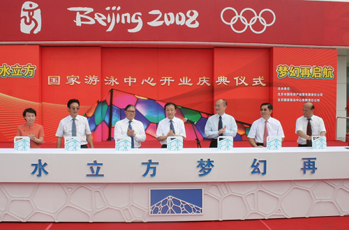 北京市副市長程紅在慶典中致辭。北京市委常委、統(tǒng)戰(zhàn)部部長牛有成宣布“國家游泳中心完成賽后改造,現(xiàn)重新對外開放”。隨后,中央及北京市有關(guān)領(lǐng)導、捐資人代表共同為水立方開啟“全新水立方 夢幻再啟航”的大門,水立方以嶄新的形象展現(xiàn)在社會公眾面前。參加慶典的領(lǐng)導隨后參觀了水立方場館,并出席了在水立方內(nèi)舉辦的“港澳臺同胞海外華僑華人支持北京2008奧運會紀念展揭幕儀式”。
