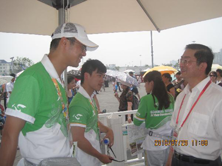 中新網(wǎng)8月3日電 據(jù)上海僑網(wǎng)消息,7月29日,上海市僑辦主任崔明華進(jìn)入世博園看望慰問(wèn)華僑華人世博志愿者,對(duì)他們不遠(yuǎn)萬(wàn)里回到祖籍國(guó)擔(dān)任上海世博會(huì)志愿者的熱情和辛勤付出表示感謝。