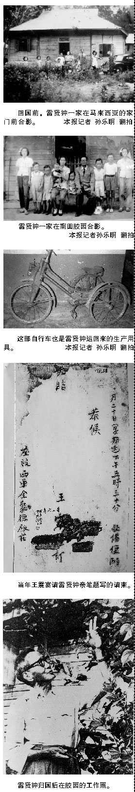 當年10月,以僑領(lǐng)莊明理為團長的全國僑聯(lián)慰問團,前來慰問愛國華僑雷賢鐘一家,于是留下這張珍貴的歷史記憶:老老少少幾十人中,有雷賢鐘一家,有慰問團成員,還有橡膠園工人和當?shù)剞r(nóng)民。