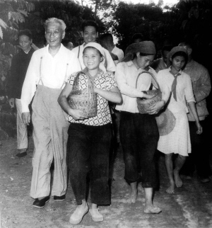 畫面上,曾六妹(前方穿花格衣服者)和她的同學張桂嬌提著滿藍的咖啡果走在前面,兩人還不時交流勞動心得,而劉少奇則像一位和藹的長者,慈祥地跟在她們身后。