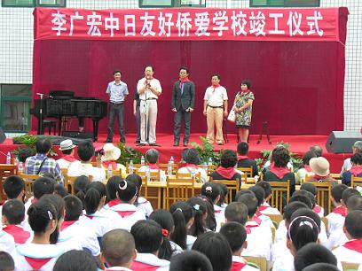 張繼勇在致辭中說,李廣宏先生情系四川、心系災(zāi)區(qū)。去年“5.12” 汶川特大地震發(fā)生后,李廣宏率日本友人五次來川,多次為災(zāi)區(qū)學(xué)生舉行演唱會,用歌聲撫慰災(zāi)區(qū)學(xué)生受傷的心靈。后又拿出積蓄52.5萬元人民幣,在災(zāi)區(qū)捐建“李廣宏中日友好僑愛學(xué)校綜合樓”。今天,在各方面共同努力下,綜合教學(xué)樓終于建成了,我代表省僑辦對此表示熱烈祝賀,對李廣宏先生及日本友人的到來表示熱烈歡迎和衷心感謝。他希望學(xué)校師生搞好教學(xué),發(fā)奮勤學(xué),為實(shí)現(xiàn)四川省“兩個(gè)加快”努力工作,以優(yōu)異成績迎接建國60周年到來。