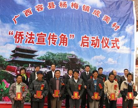 “僑法宣傳角”是國務院僑辦開展“五五”普法、宣傳《中華人民共和國歸僑僑眷保護法》及其實施辦法的一項重要舉措。玉林市外事僑務辦積極推薦并爭取到在楊梅鎮(zhèn)成美村設(shè)立“僑法宣傳角”。成美村有人口4000多人,有歸僑僑眷3600多人、海外僑胞4280多人,有僑屬企業(yè)2家。該村黨總支部、村委會辦公設(shè)施先進,功能室健全,每天到村辦事、開會、讀報、學技術(shù)、娛樂的人員均有百人以上,并重視宣傳僑法、維護歸僑僑眷的合法權(quán)益,聘請了27位村民小組長、村民代表為“僑法宣傳角”義務宣傳服務員。在這里設(shè)立“僑法宣傳角”,有利于廣泛深入地開展僑法集中宣傳活動,加大僑法宣傳貫徹落實力度,進一步營造愛僑、護僑、惠僑的良好社會環(huán)境。