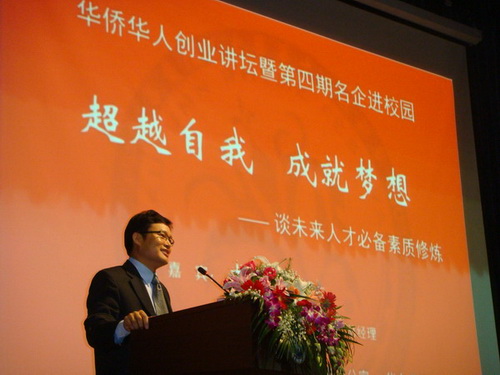中新網(wǎng)12月30日電 據(jù)上海市僑辦消息,近日,由上海市僑辦與華東理工大學(xué)共同主辦的“華僑華人創(chuàng)業(yè)講壇”第三講在華東理工大學(xué)逸夫樓舉行。本次講壇特邀英特爾公司中國執(zhí)行董事、總經(jīng)理戈峻博士作主題為《超越自我,成就夢想――談未來人才必備素質(zhì)修煉》的精彩報(bào)告,并與華東理工大學(xué)師生互動(dòng)交流。