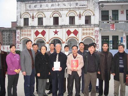 當天下午,年近九旬的莊炎林,不顧旅途的疲勞,在梧州市僑聯(lián)主席鐘小欣、蒼梧縣統(tǒng)戰(zhàn)部部長李燕芬等領(lǐng)導的陪同下,來到蒼梧縣石橋鎮(zhèn)中心小學考察。其中心小學是莊炎林先生在抗日戰(zhàn)爭期間,以教師身份掩護開展地下工作的地方。今日重游故地,莊炎林先生格外激動,并向陪同人員講起了當年的工作情景。隨后莊炎林先生一邊聽取該學校的情況,一邊參觀當年曾用過的工作室,并在留言簿上題詞:為國利民,奉獻力行。(蔡光天)