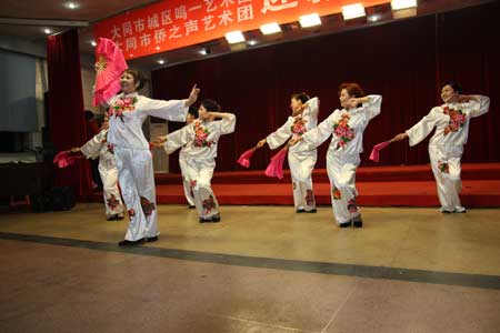 據(jù)藝術(shù)團(tuán)團(tuán)長(zhǎng)周玉萍介紹,“僑之聲”藝術(shù)團(tuán)成立四年來(lái),始終堅(jiān)持以僑為本、為僑服務(wù)的工作理念。在大同市僑聯(lián)的正確領(lǐng)導(dǎo)下,經(jīng)常下基層以文藝的形式宣傳《僑法》、慰問(wèn)僑胞,僅2009年參加的全國(guó)和省市舉辦的文藝活動(dòng)達(dá)6場(chǎng),并獲得有關(guān)部委的表彰。在新中國(guó)成立60周年之際掀起的大唱“紅歌”活動(dòng)中,藝術(shù)團(tuán)為基層演出并現(xiàn)場(chǎng)輔導(dǎo)更是高達(dá)20多場(chǎng)。領(lǐng)導(dǎo)的支持、政治上的鼓勵(lì)極大的帶動(dòng)了歸僑僑眷的工作熱情。