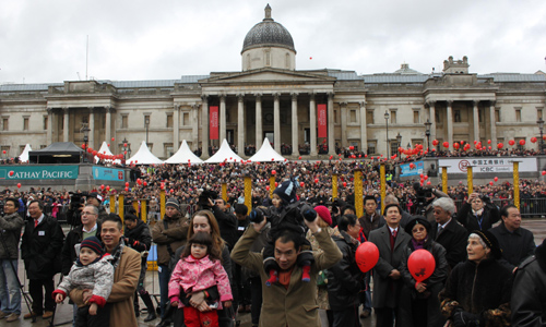 中新網(wǎng)2月22日電 2月21日中午,近三十萬英國華僑華人及當?shù)孛癖妳R集在倫敦特拉法加廣場,共同觀賞了由中國國務(wù)院僑辦副主任任啟亮率領(lǐng)的“文化中國•四海同春”藝術(shù)團的精彩演出。中央民族歌舞團極具民族特色的歌舞和著名歌唱家劉斌、呂薇、桐瑤的傾情表演深深地打動了數(shù)以十萬計的觀眾,使廣大旅英僑胞在春寒料峭中感受到了來自祖(籍)國的溫暖,也使在場的外國朋友領(lǐng)略到中華文化的魅力。
