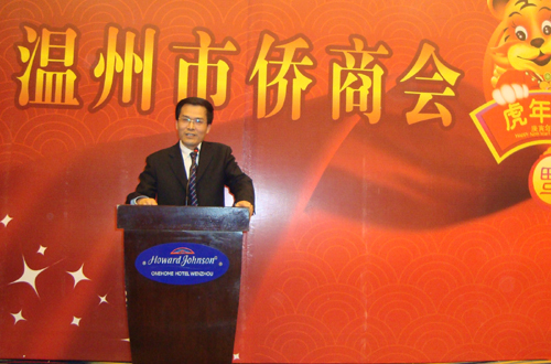 中新網(wǎng)3月4日電 據(jù)溫州市僑辦消息,近日,浙江省溫州市僑商協(xié)會(huì)在萬(wàn)和豪生大酒店舉行“2010年新春酒會(huì)”,溫州市委常委、統(tǒng)戰(zhàn)部部長(zhǎng)陳作榮,市政協(xié)副主席姜嘉鋒,市僑辦陳永聰主任、副主任許捷、周海平及有關(guān)涉僑部門負(fù)責(zé)人和僑商會(huì)會(huì)員代表共120余人出席酒會(huì),共慶元宵佳節(jié)。會(huì)議由溫州市僑辦副主任、市僑商會(huì)常務(wù)副會(huì)長(zhǎng)周三榮主持。